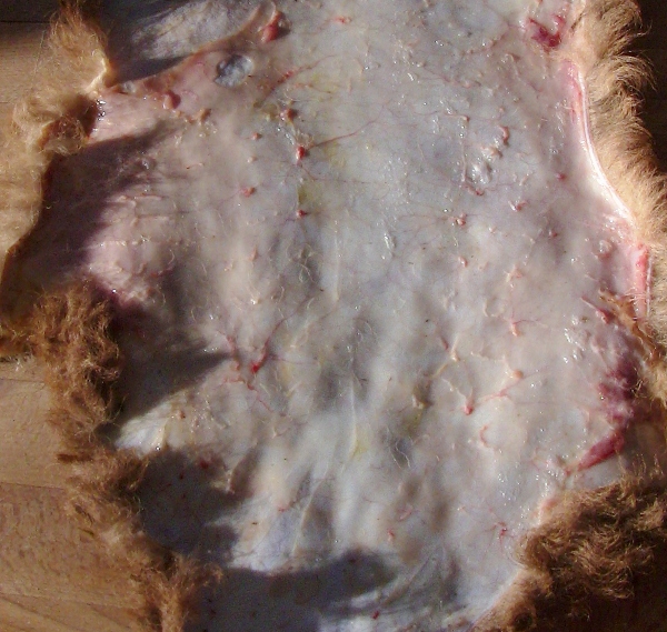 None the less,  I now have a little lamb hide to do, let me tell ya, if you think rabbit hides are thin, you have never worked with a day old lamb pelt.. you need to be so!! careful, I knicked a line, thankfully its on a edge, so easy enough to trim off once the hide is done..