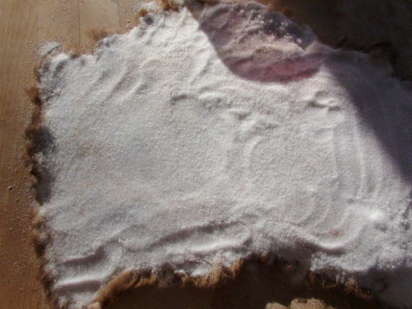• it is lovely, I will leave the salt for a week to two and then work it again, just as I am showing the process with the rabbit, I will with the lamb hide.. Just found out that I am getting back 220 pds of cut/wrapped meat from angelo.