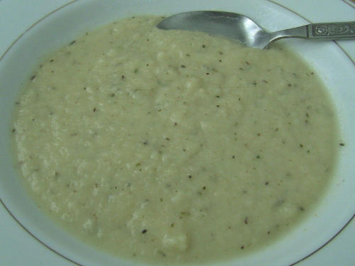 - 1 head of califlower, clean out the green, stem and cook in just enough chicken broth to do so, add in 1 tsp of minxed galic, 1 tsp of italian spice blend, Salt to taste and a good amount of cracked black pepper. When cooked Blend it with a stick blender or in a blender.. then add in 3/4th cup of good whole milk (I used sheep milk) and one tbsp of butter, mix, melt and heat though..