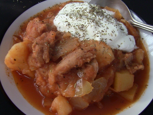 Take a heavy steel bottomed pot and put in a drizzle of oil oil or about a spot of lard the size of a walnut and melt it out on med heat, cook your onion, garlic till clear, add your tomato, veggies and simmer till either just done or till well done.. At the end add your cooked diced rabbit to heat though and serve with the yogurt or sour cream on top.