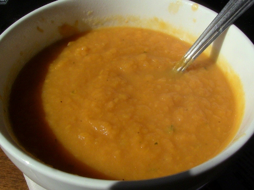 for mom I make mine a little differently – I start with garlic, onions, and curry in olive oil, add chicken stock and cubed sweet potato. Once cooked, I put it through the blender. I like the idea of the yogurt or sour cream to top. I will have to try that next time.