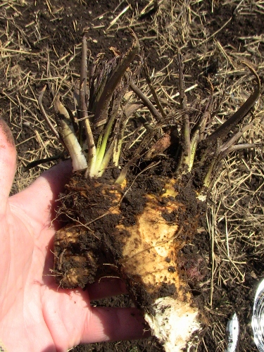 last but by no means last, was this horse radish that had shown up at a no-no place, now I will need to go back out with a big shovel and dig out the rest of the main root, but this will do just fine for fresh horseradish in the house of a couple days.. the four inch green tops have been cut off, washed clean and chop to be added as a fresh green to a dish.
