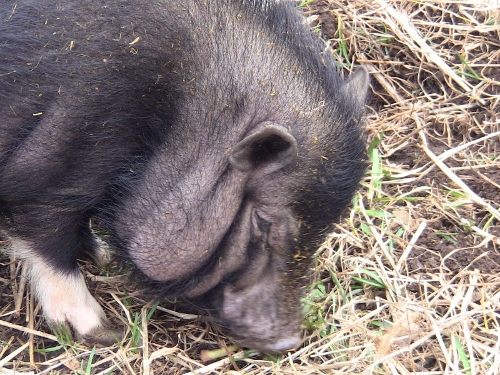 When it comes to the big pig, its a bit easier, you just bribe her up on to the boards of her pen with cookies, one can feed her, while the other trims.. done and done, cause without a stock crate, there is no way you can make her do anything of the sort.. but the difference is that Miss Piggy is a much more calm and steady temperment.