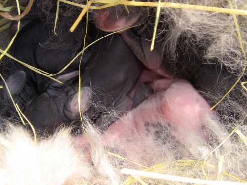So far I have barely peeked in the nest, I pulled back the hair, snapped this photo, tried my best to a head count (I think six or so?) and then got out of her box, in a couple days I will be able to go back in and check more, I can peek in the box but as long as the kits are in their puddle and covered in hair, I will let momma be.