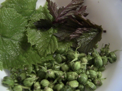 - half a cup of even mix of blackberry leaves (fresh young) and grape leaves(fresh young)