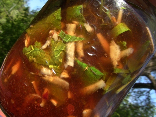 From the gardens I pulled fresh itty bitty baby garlic and used both the bulbs and the greens, fresh baby horse radish greens (with the stems removed and a 3 inch piece of root, washed, peeled and grated in, filled and poured over, and into the fridge for keeping for when I want to use them over the next days to week plus..