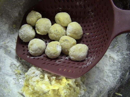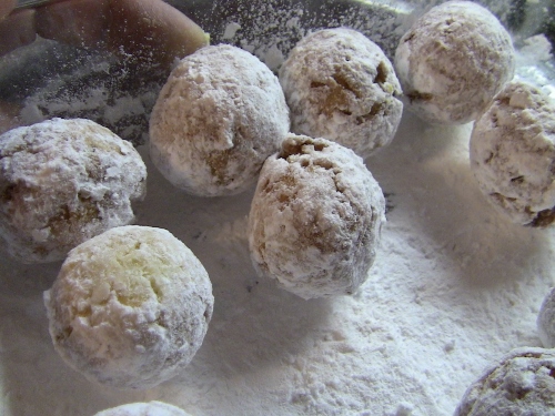 you want itty bitty balls, about a inch to a inch an quarter, once your oil is ready drop them in and when they are cooked they will float and self-flip after browning, check the other side and use your favorite fritter covering, some like them with a drizzle of jam, others honey, others like them in a sugar roll, I like them in iced sugar covering, you could also glaze them if you wanted..