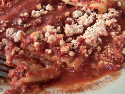 it was spiced/herbed/salted and stuffed into pasta tubes and smothered with thick pasta sauce, and baked.. yum, yum..