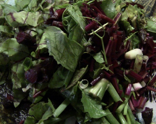 A huge bunch of baby beets and beet greens, fresh green onions, plus one other dark green, I used pea leaves, but it could just as easily have been horseradish greens or mustard greens or spinach etc.