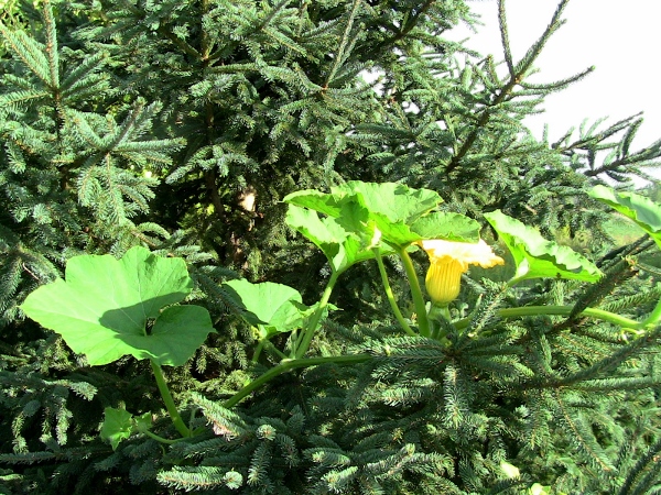 My goodness. That is the first time I’ve ever seen blossoms on a conifer! Can they support the heavy squash?