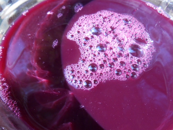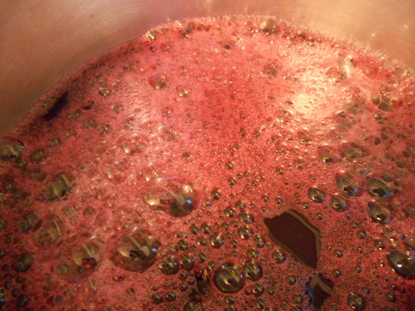 Fresh cold grape juice, its been strained for the second time, needs to be brought back up to a boil and then the sugar added.. but while doing that, you need to get your jars, lids and water bath boiling water ready..