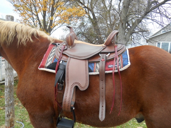Here is a better close up on his special saddle blanket that is done to help the saddle fit proper with his steeper shoulders, its different, while I tacked him up, as of yet the saddle has not been ridden yet, it sure is a heavy one, leather compared to my non-leather. We are going riding this weekend, I am not sure who is riding who yet, but the saddle will end up on whoever DH is riding, there is a inch difference in seat, mine is a 18 and this one is a 17 inch.