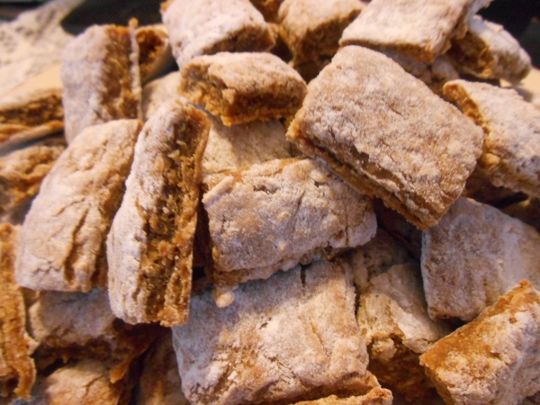 Floured the pans, pressed it out, cut marked it, baked, then took it apart, cut each stripe into four and baked again, then allowed to sit in the oven overnight to cool and dry..
