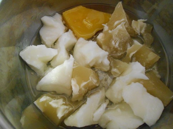 So for a first time, try 2oz of beeswax, 2 oz of a hard at room temp oil, and 2 oz of a liquid at room temp..  My own reading seems to say that for hard oils, coconut or tallow are the best choices, for the liquid oil, I have read, almond oil, olive oil, or any other good quality oil that you have in the house, (Do keep in mind that Grapeseed oil goes rancid very quickly, so be aware of that one, make a very small batch so its used up in three months ideally)