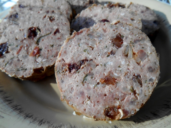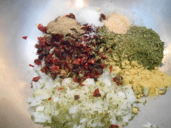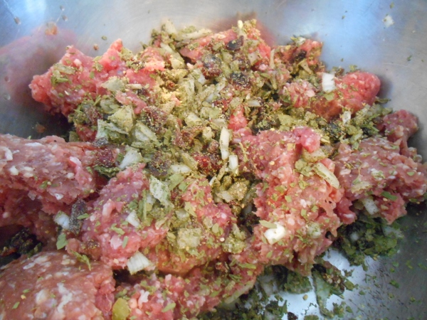 I mixed the spices, fruit, onion and nettles together and then put it over the meat, mix really well with super clean just washed hands til its all mixed in, should have no area’s that look like just meat if possible.