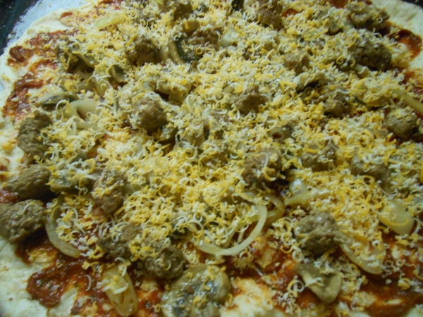 This pizza was not one of my easy throw it all on there and cook it.. it was in fact a fussy thing.. I need to cut and cook the meat in little bites, cooked in garlic, and the mushrooms and I wanted to cook the onion down to sweet bites of heaven.. Baked with a mix of white and dark sharp chedder in a hot oven of 400.