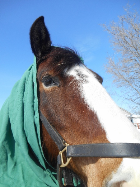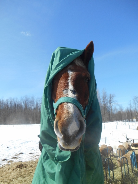 Its been so cold that the horse’s are getting three to five -five min training sessions daily this past while, yesterday’s one of the little pop outs was to give them granny head wraps in green in honor of St. Paddy’s..
