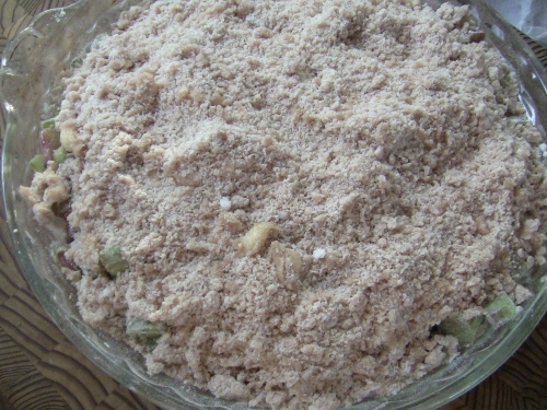 one cup of sugar (depending on your rhubarb tartness along with 1/4t cup off flour and a good pinch of ground ginger, mix together and put in the bottom of the pan
