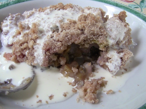 I made a regular crumble topping, (so butter, sugar and oats and flour) but instead of water, use orange juice concentrate and a 1 tsp of cinnamon in the crust.. bake at 350 till edges are bubble and top golden