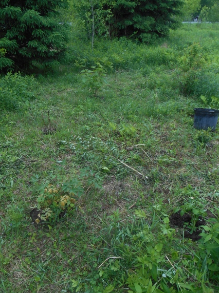Now despite that it looks like there is not much there, the bones are in fact going in..  its hard to get a single photo of the area so we are missing the apple tree heading to your right. but so far this spring, the diamond has had Black  Chokeberry, Black Rasberry canes, Gooseberry, High Bush Blueberry, Burning Bush, Rose Bushes, Elderberries bushes, Red, Pink and Blue Beebalms, Applemint, Northern Spy Apple Tree, Ruby Red Rhubarbs, and Bleeding Heart, Horseradish, Violets..  Many of the above plants will be moved in, once the ground is prepared for them..