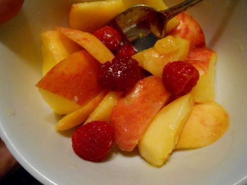 Yesterday, we had a lovely treat, fresh peaches with homegrown rasberries