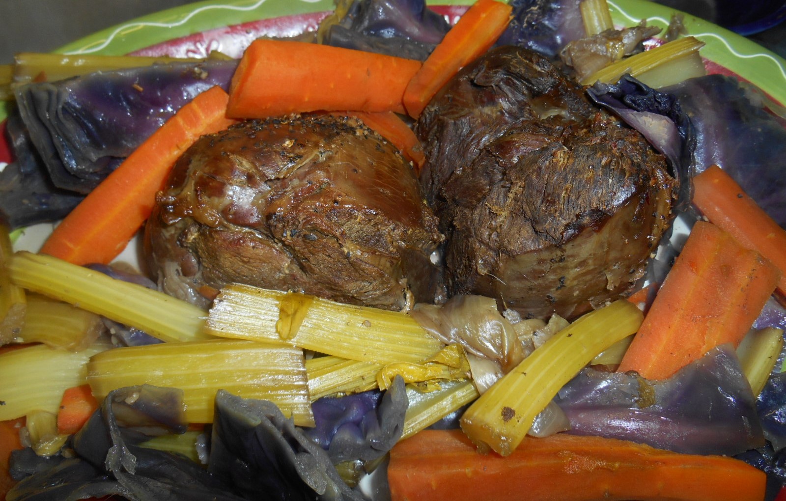 Peel and then sliced your onions into thick rounds for the meat to sit on, same with a few garlic cloves, I covered the meat with montreal steak spice, and then I filled in the area around with purple cabbage, celery and carrots.. added in some water to the bottom and into a slow oven at 325 for around four hours..