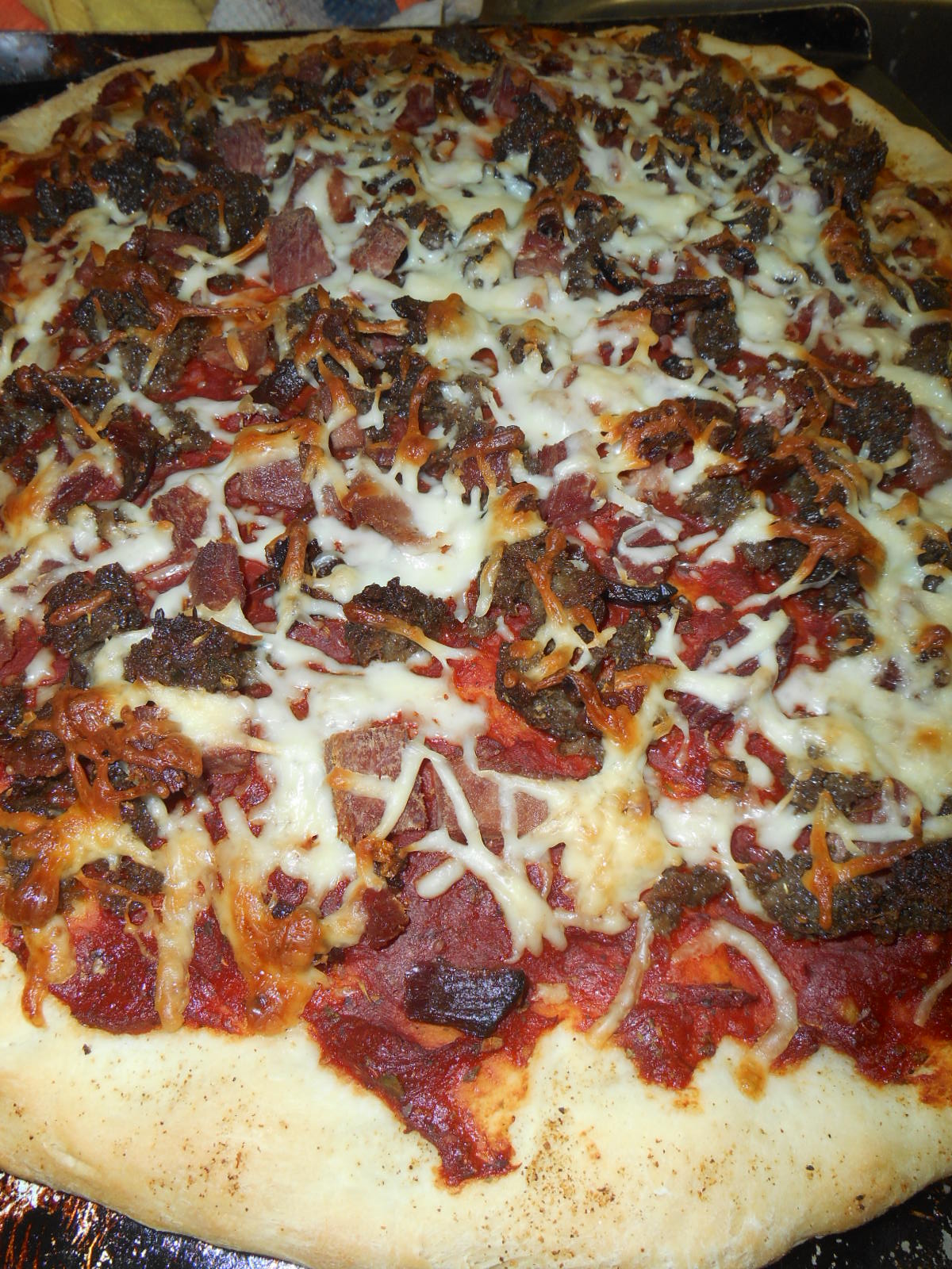 This bad boy has ham, bacon and homemade sausage.. three kinds of pork, some spice heavy tomato base and mozza cheese on my fresh bread bottom..