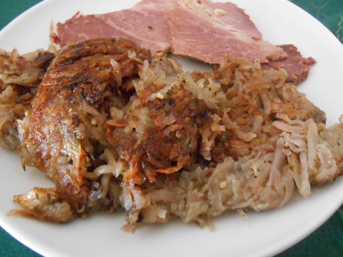 However, I am in the hard part of winter and eggs are not near as easy to come by till the hens start laying more.. so these are much more basic.. Grated potato, grated onion, minxed garlic and herbs and spices to taste, fried crispy in a bit of bacon fat. It was served with a bit of leftover ham and hot cuppa as a hearty breakfast for a good work day on the farm