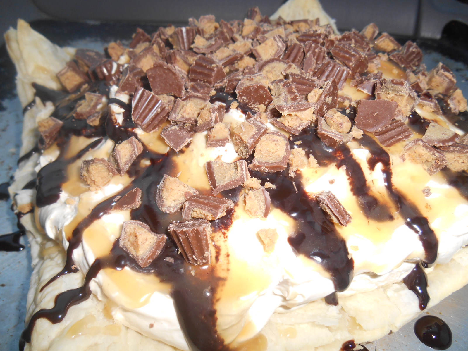 In a mixing bowl with beaters, beat the cream cheese till fluffy. Add in the peanut butter, beat till fluffy again, then add in the cool whip and gently fold it in, until all mixed threw, and put into the cooled pastry bowl, then drizzle chocolate and carmel over top, and cover with the chopped up cups..