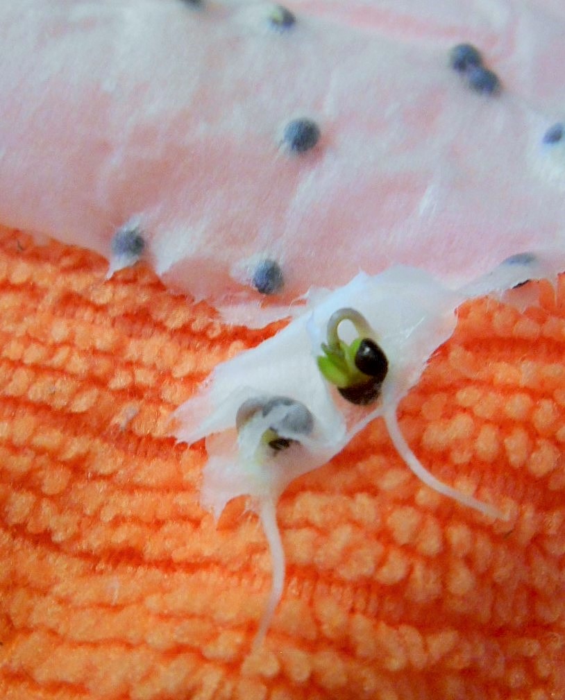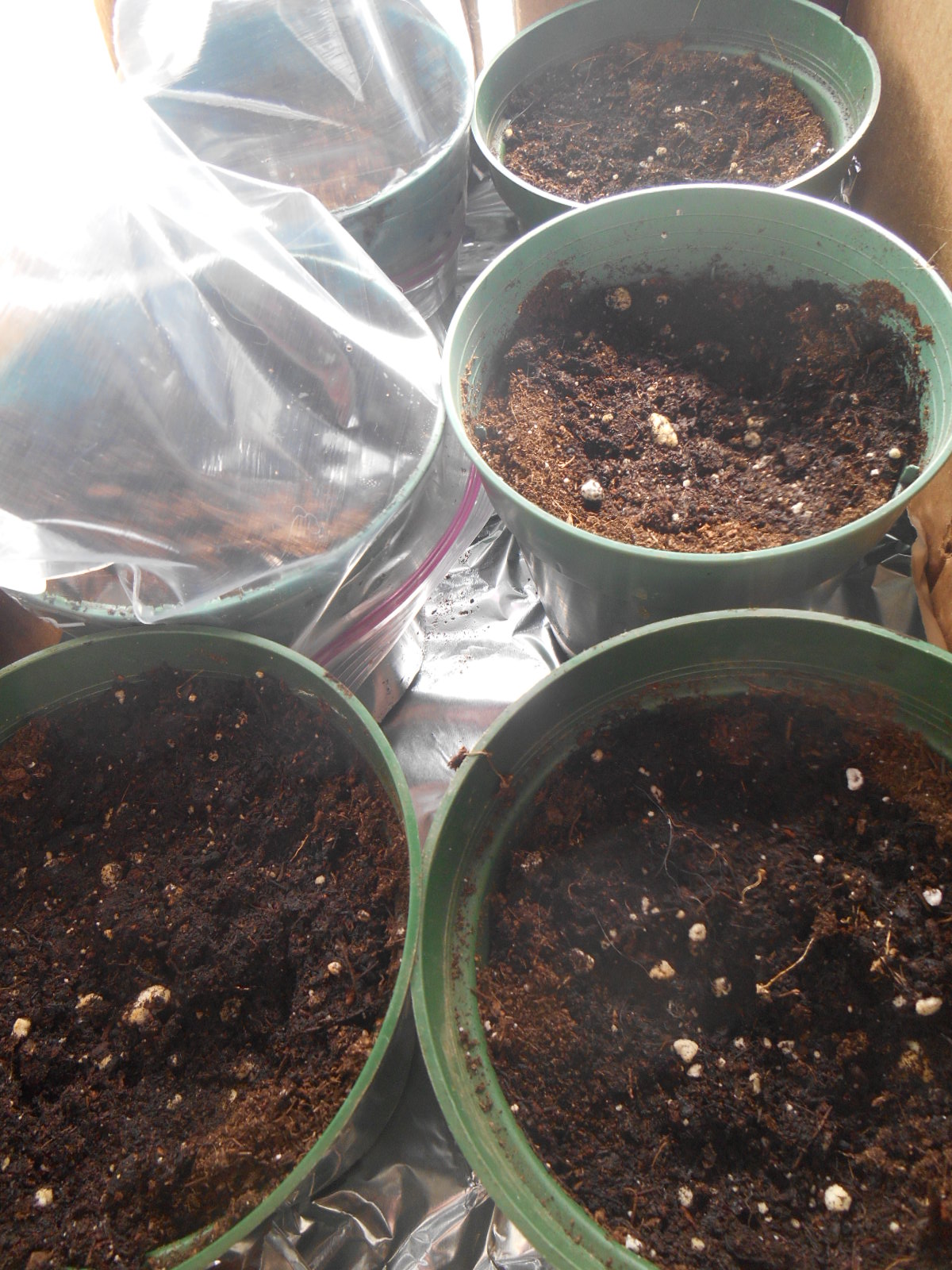 These seeds were started with the baggy method, then once sprouted where moved over to the soil, they are the ones in the baggy covered pots, the other pots are planted with peas