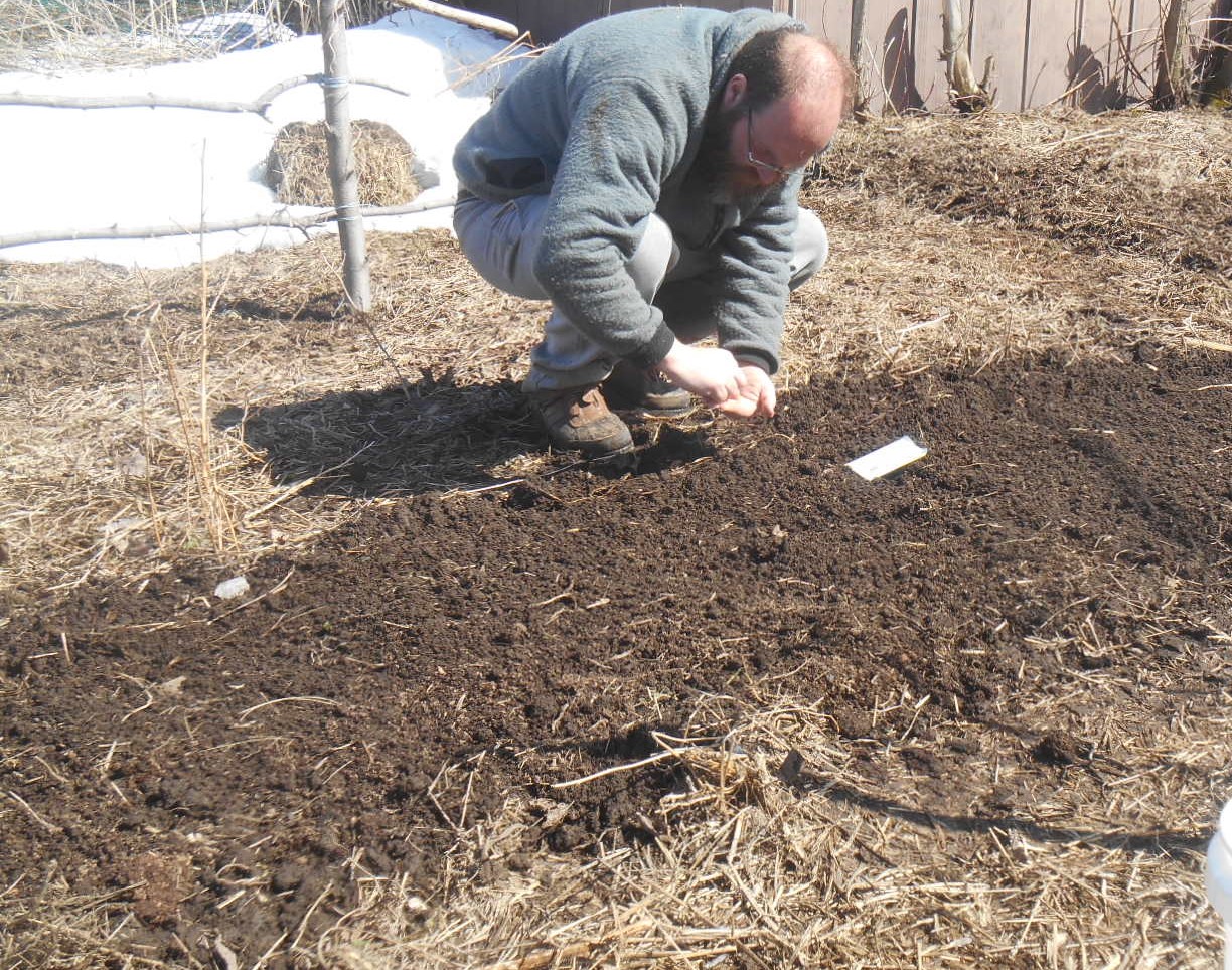 We planted out Peas, Raddish, Kolarabi, Beets, Kale, Mustard Greens.. Zone 5 and if you look, you will see that behind him is snow that has not melted out yet. This week is all about working the soil and adding in compost, a bit of ash. mixed in.