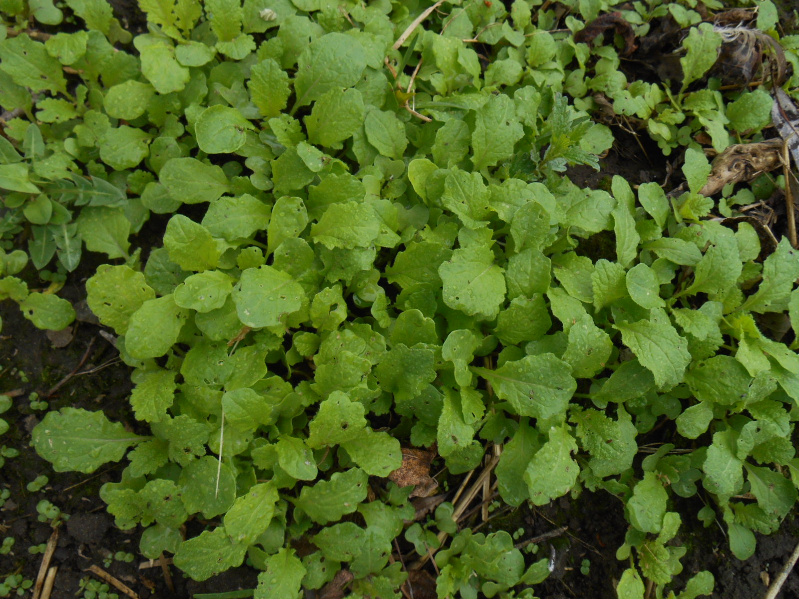 This is a lovely patch of self-seeded mustard greens, and its a big one, we snipped of 3 cups of fresh baby mustard greens, they are on their second or third set of true leaves.