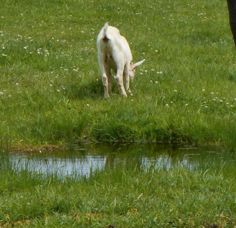 She is trimming the trees, and is doing a great job at eating things that the horses and sheep have not been eating but its funny because the lamb flock follow her and they are trying new plants because she is eating them.. makes me laugh..