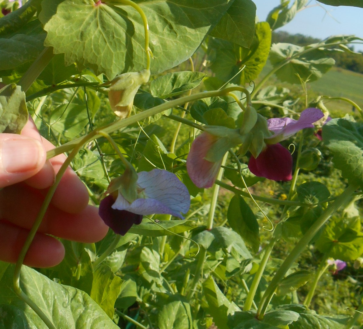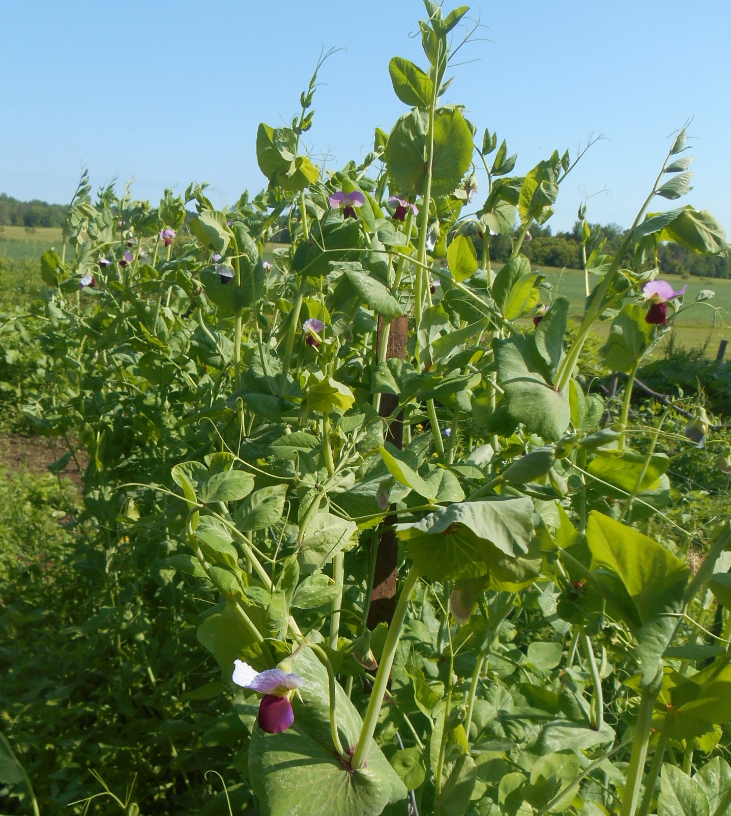 This is a update on the Carouby De Maussane Snow Peas, the earliest planted are pushing seven feet in height, they are in full bloom now, and they are showing just how pretty the flowers are, and they change color as they age..