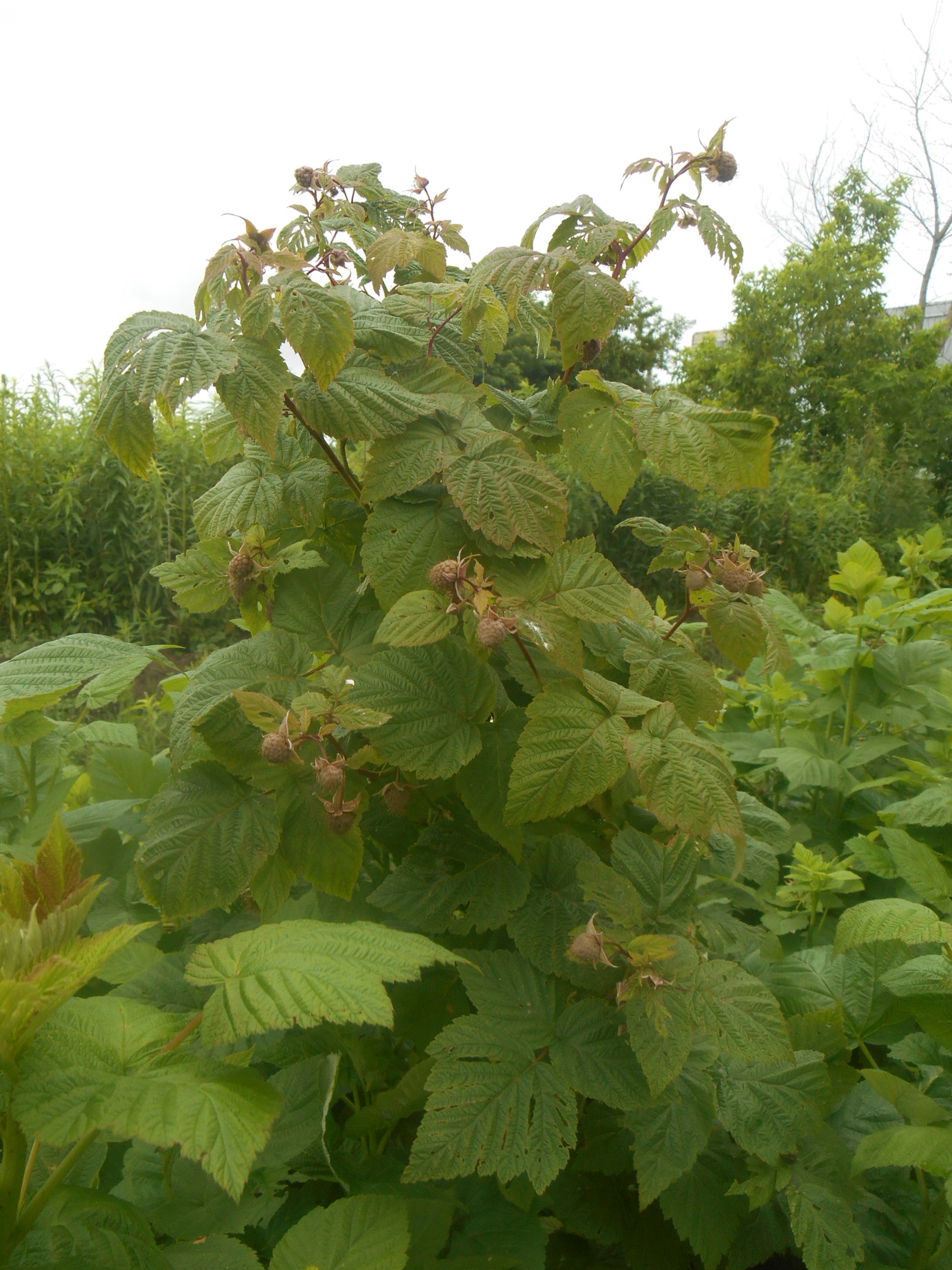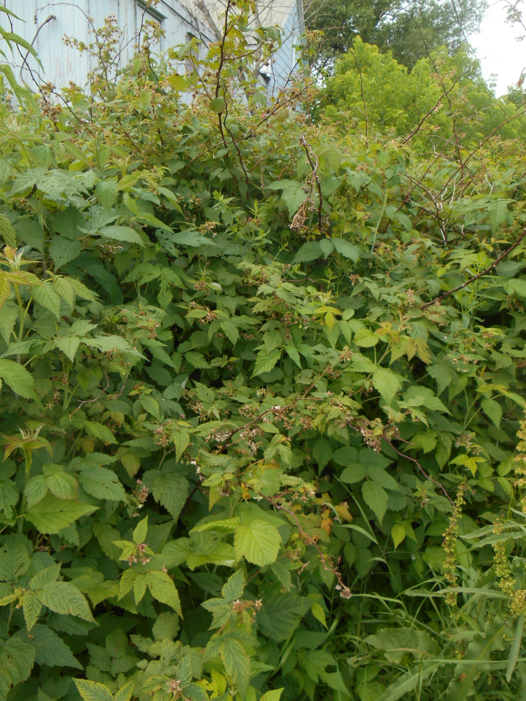 The crazy, really needs to be pruned and pathed wild rasberries are loaded, they will be small, and they will be dark and tart..