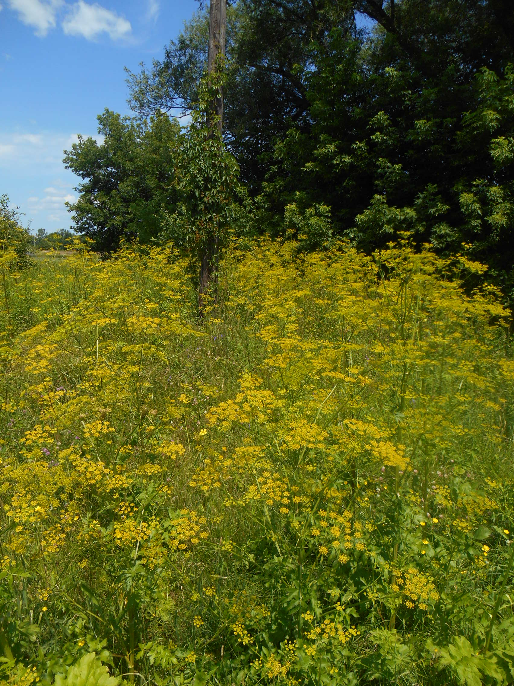 Wild parsnip, which is also known as poison parsnip, is a member of the carrot/parsley family. It typically grows a low, spindly rosette of leaves in the first year while the root develops. In the second year it flowers on a tall stalk and then dies. The plant can form dense stands and spreads quickly in disturbed areas such as abandoned yards, waste dumps, meadows, open fields, roadsides and railway embankments. Its seeds are easily dispersed by wind and water, and on mowing or other equipment.