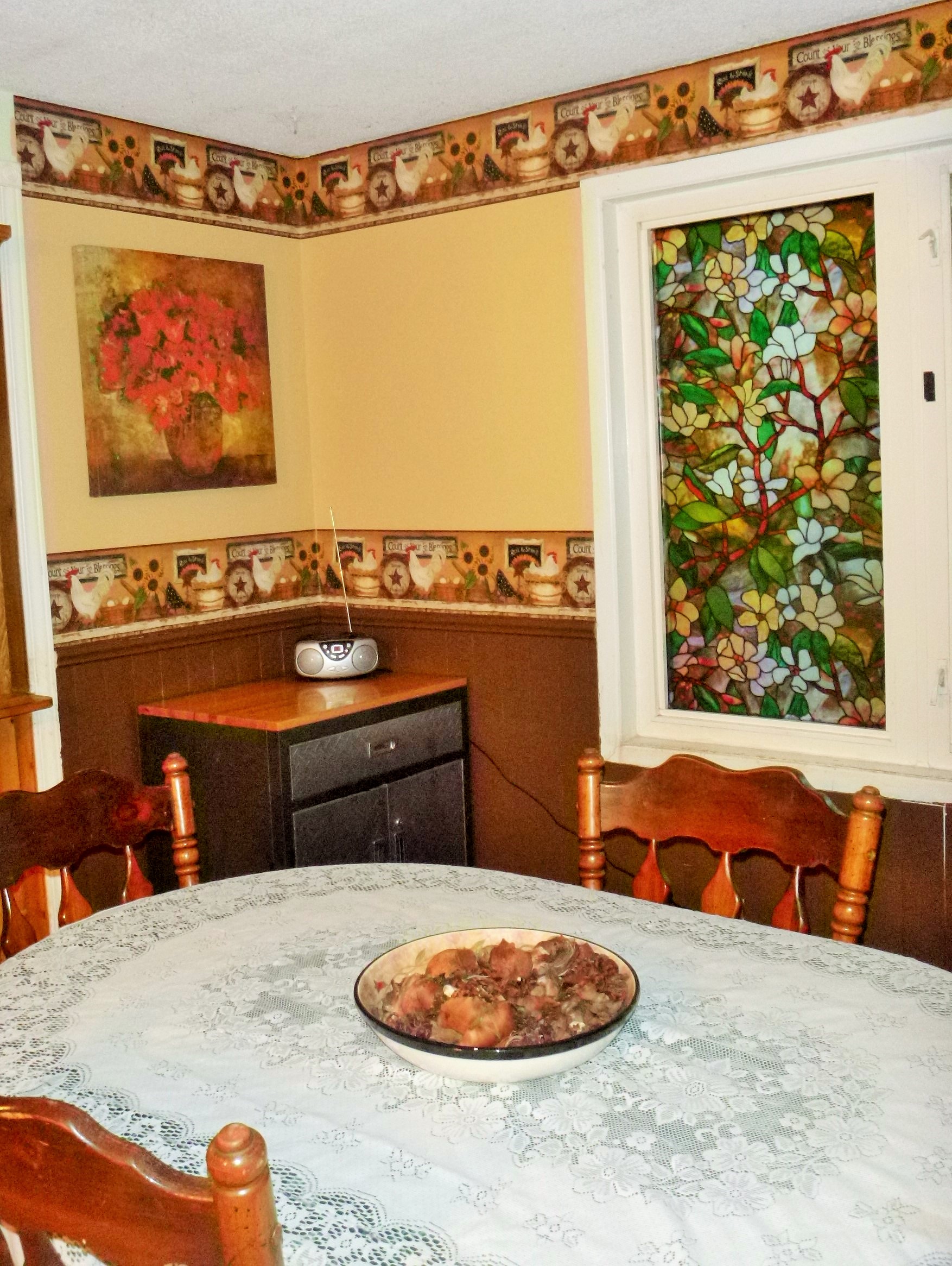 I love the wall border!!! And that stained glass is gorgeous! We’re about to buy a house and I spend most of my time trying to figure out how to decorate/paint the living room/dining room area. The rest of the house is very vintage and has been restored to a gorgeous pre-1950s style, and trying to preserve that look is a fun challenge.