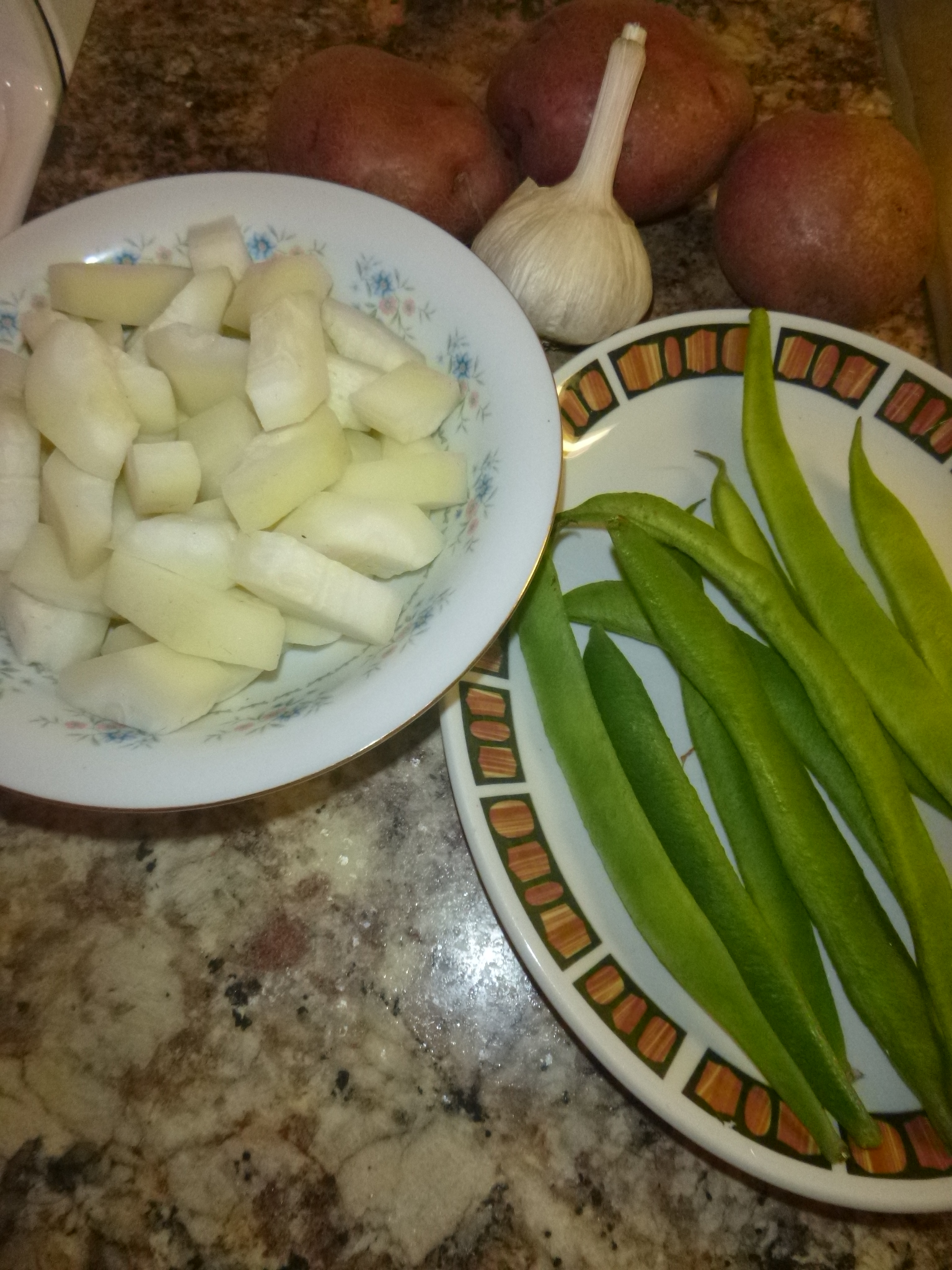 Add everything into a pot with 8 cups of premade white meat or veggie broth, with salt, pepper, basil or nettle greens, a bay leaf (remove before serving), cook until the potato is done, the rest will be so. The beans will be tender but still holding firm, the winter melon will be melt in your mouth tender, the garlic will add a bit of a tiny bite now and again…