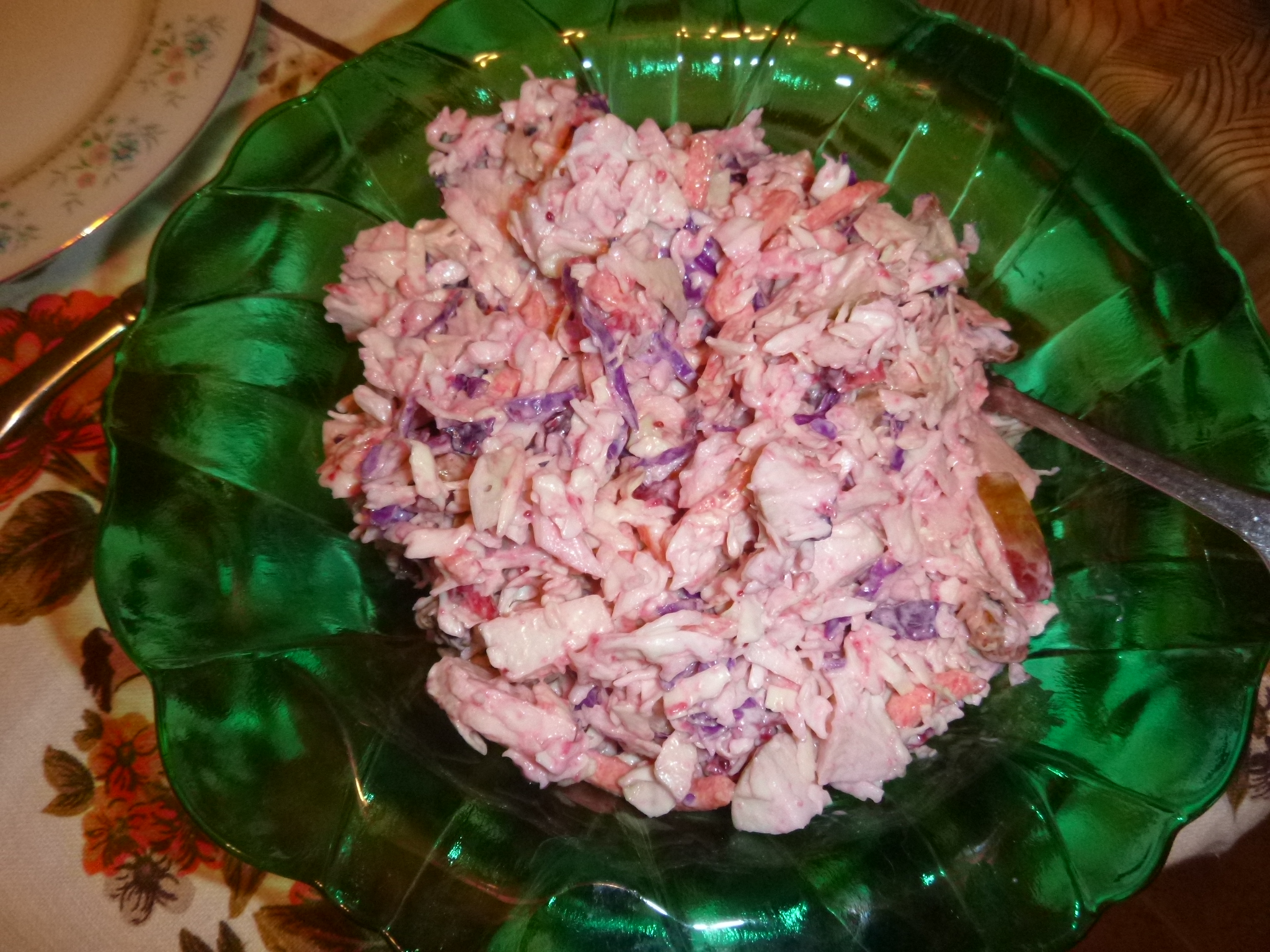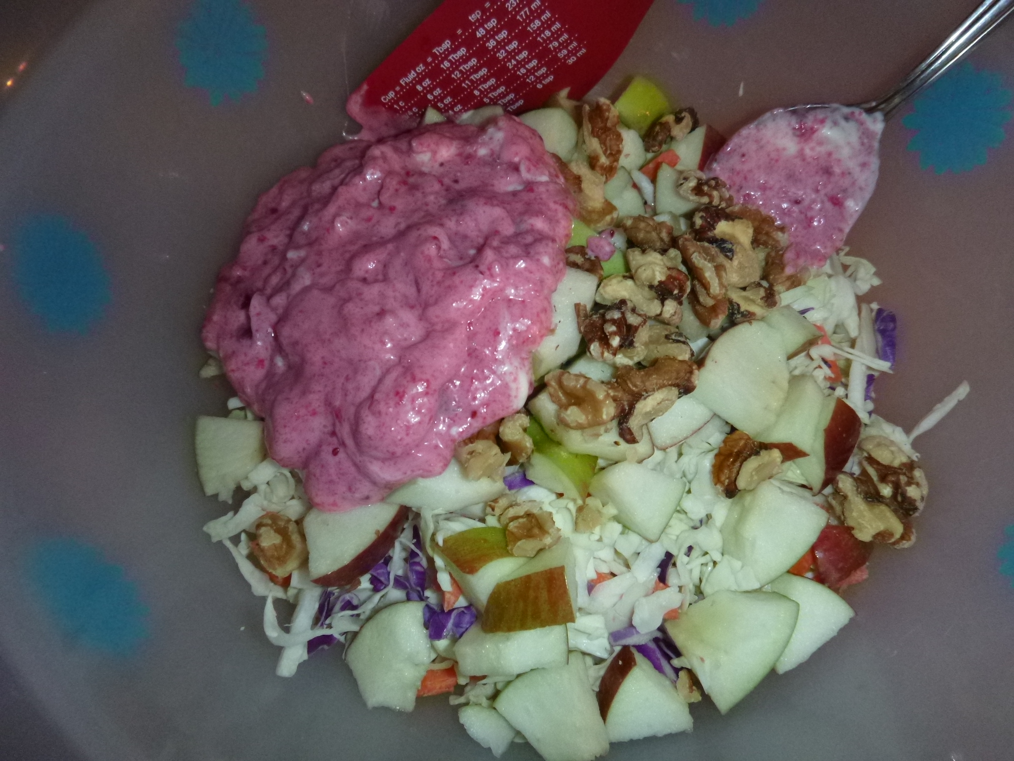 Four to six cups of diced cabbage, a grated med carrot, a bit of diced purple cabbage if you have it, can also use a bit of grated turnip, one diced apple, quarter cup of walnuts, the dressing is half a cup of my cranberry jam, with a quarter cup of dressing (if you like it wetter, add more dressing as required) a touch of salt (pinch).