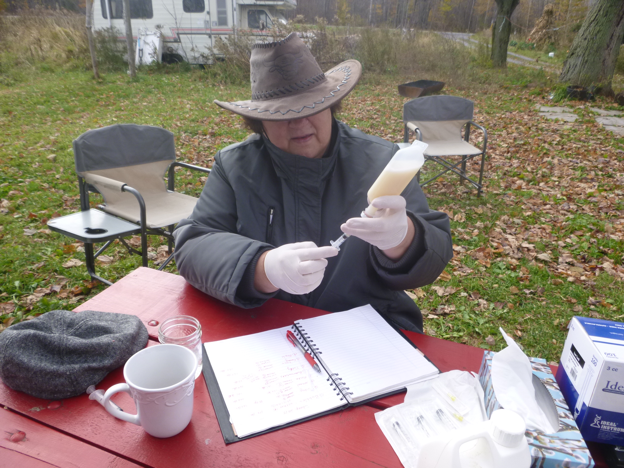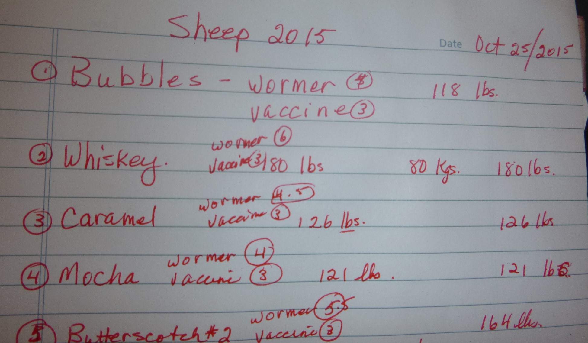 Mom was in charge of the book this year, she took the measurements given, figured out the math with the cheat sheet that hubby made for her(she was having trouble moving from kilograms to pounds) and made up the wormer shot and the vaccine needle for me.