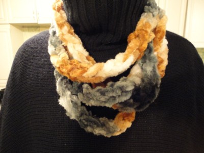 Making looped scarfs for our own use, I wear these a lot, this one is a fancy go to town pretty but I have a number that I wear that are farm chores ones