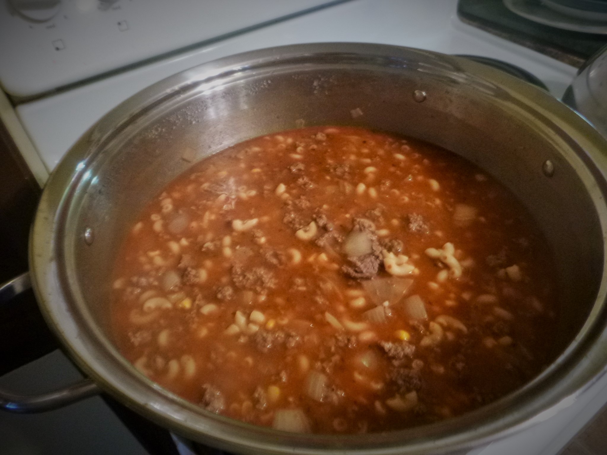 According to my readings, there have been recipes of the N.A. type since 1914, but the only real cross over is beef.. Its basic’s are ground meat (instead of meat that is long slow simmered till its fall apart tender), tomato based, which include sauce or diced and spices.. and its removing the root veggies and replacing it with pasta, normally elbow macaroni. (this was made in my big soup-stew pot, it holds 13 Quarts)