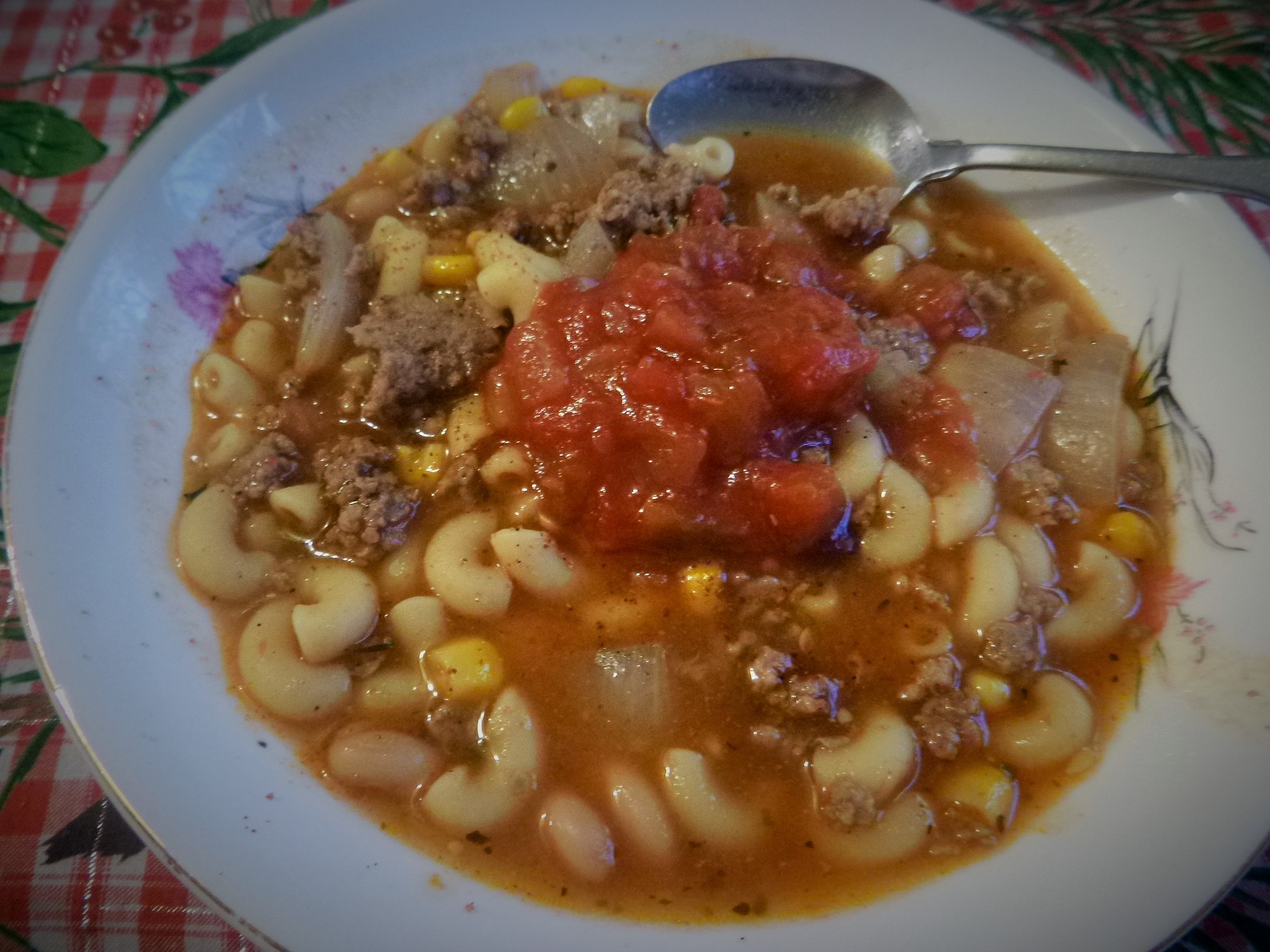 looks a lot like my hamburger tomato macaroni soup except for the beans & corn