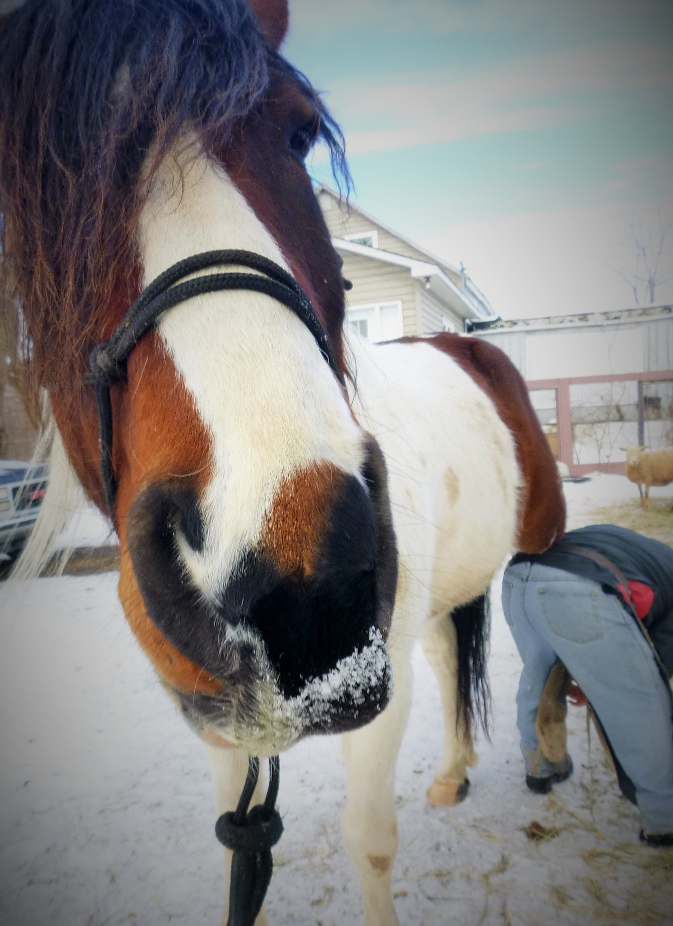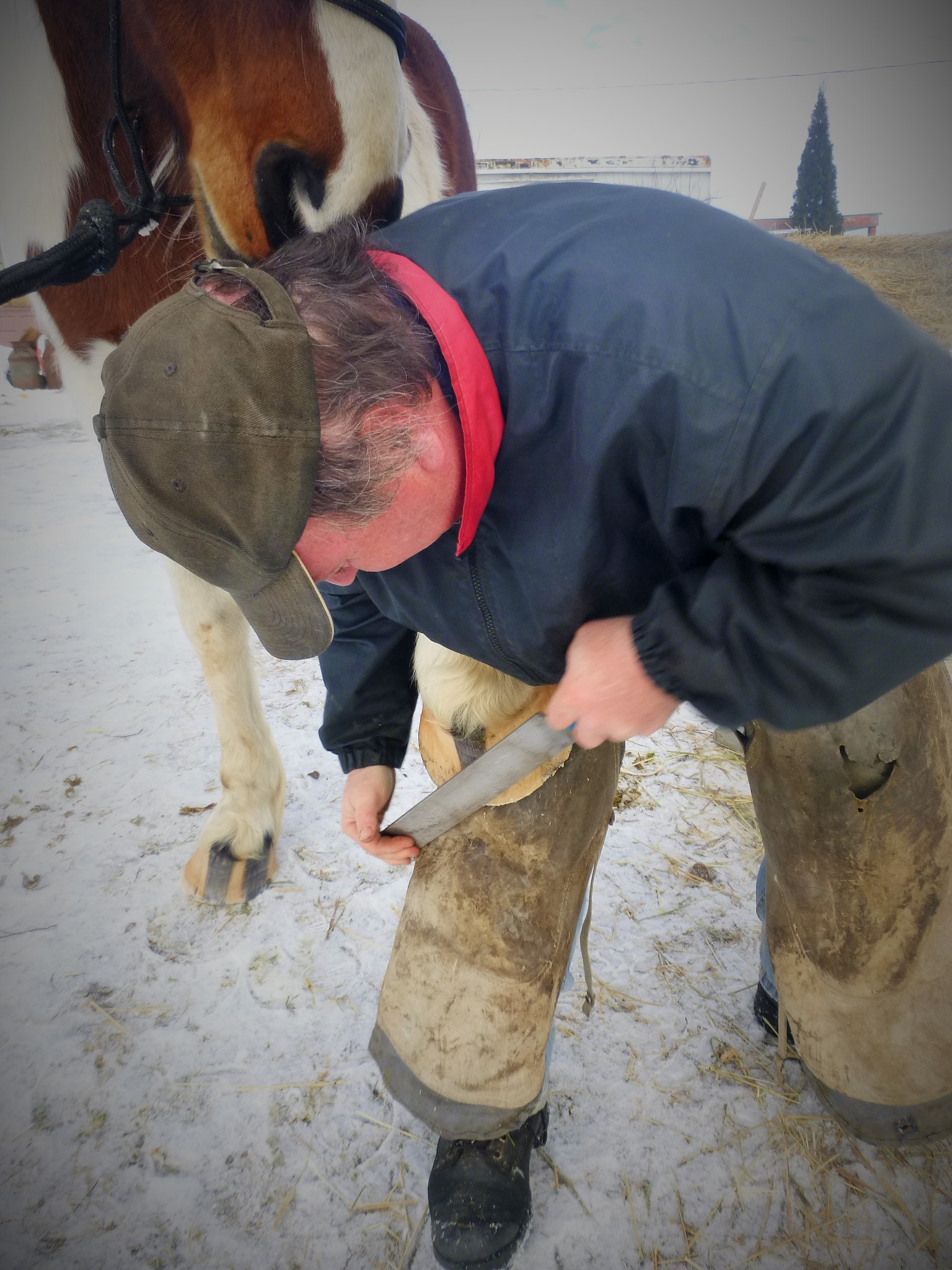 I have a long time farrier do my thoroughbred cross, but we do our draft horses ourselves. I have taken a course on equine functional anatomy through the University of Quelph, and own Butlers ‘The Principles of Horseshoeing’ which is a very comprehensive book on the hoof. I call my vet for floating their teeth – she does a beautiful job (and they get a shot before hand to relax them).