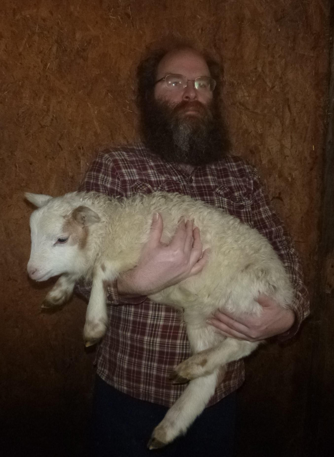 Look at this huge two week old Butterscotch-Whiskey polled ram lamb.. outstanding! I used hubby as a way for you to see the size difference.