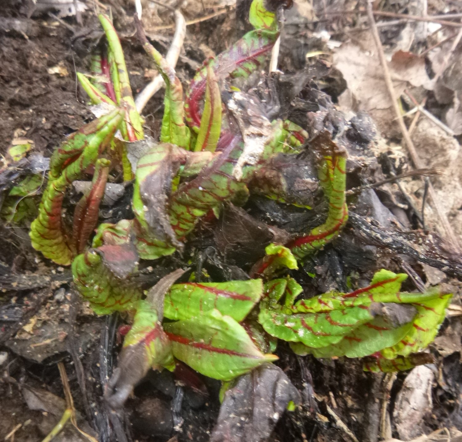 While we are cleaning up bed and planting them out for the very early starts, we are also finding new wee growth.. this bed looks bare but got daylilys coming up, the black-eyed Susan is alive, the bloody docks are coming up, see one below, and the back is seeded out into broad beans, the bigger areas are seeded into scotch curly kale, self-seeded dark russian dill seed and when its time weather wise, I will put a row of marigolds in the front, I had an over wintered Brussel sprout but pulled, sadly, none of the kale in this bed overwinter