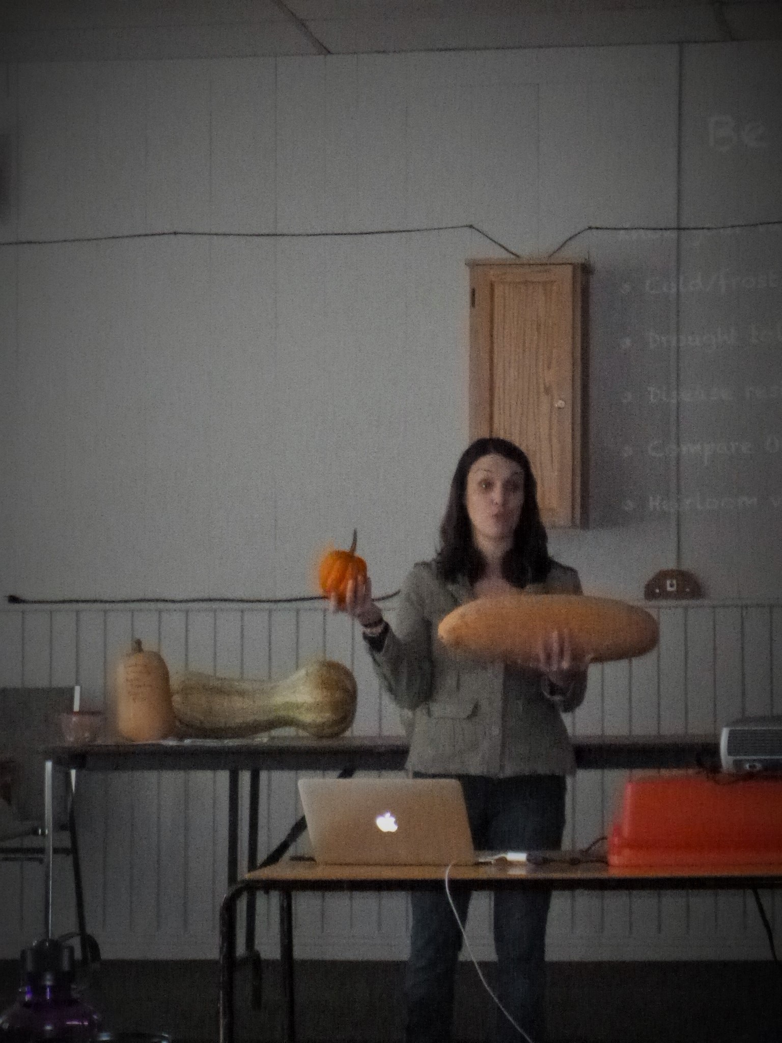 This was a great talk on intensive gardening and succession planting.. the photo was showing a great point, the squash plants took the same space but one produced six of the little ones and the other produced four of the big ones.. got to love her banana squash, its a thing of beauty!