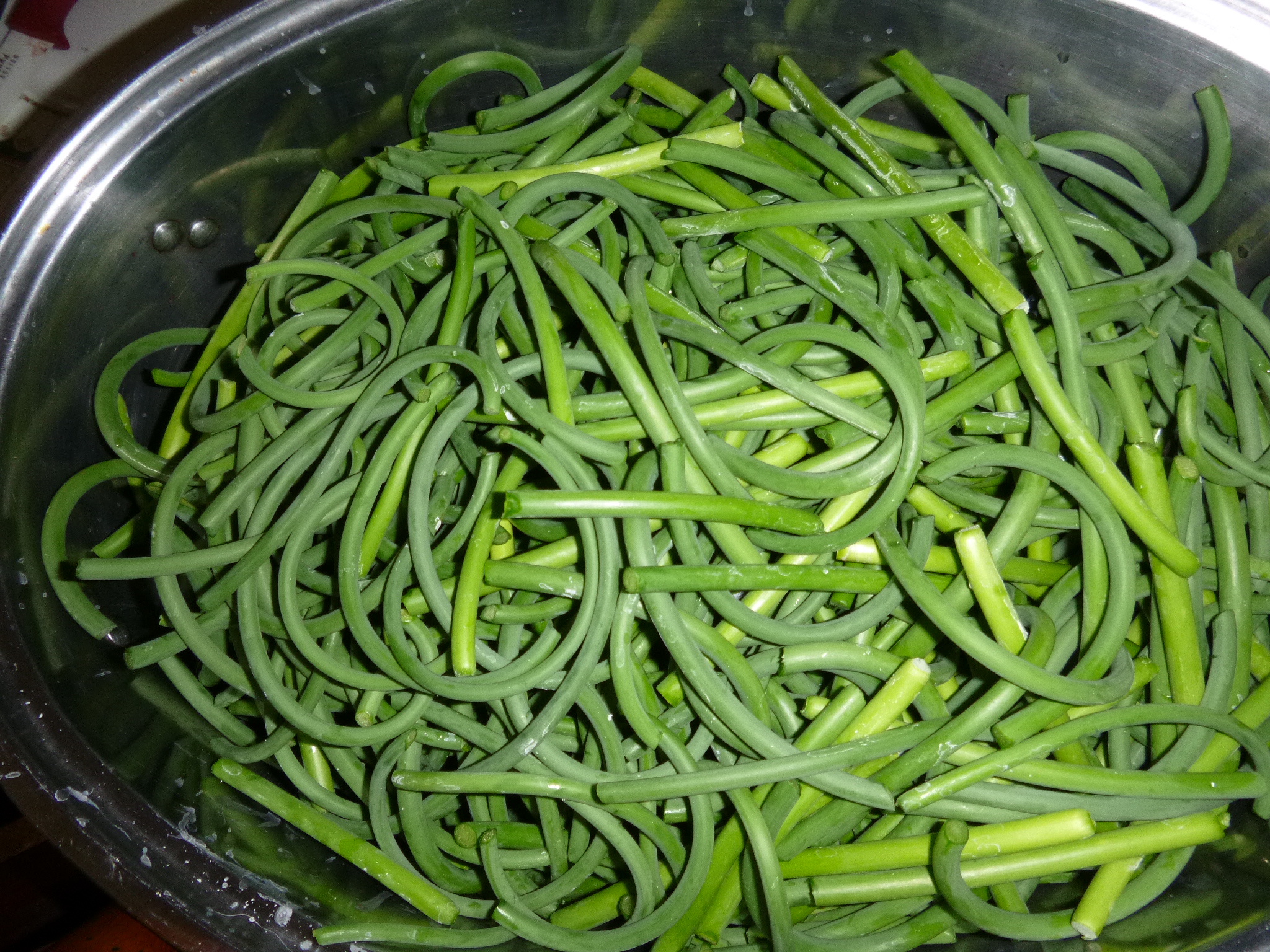 Tip and tail your garlic scapes, wash them well in cool water, then drain and cut them into two to four inch pieces, this really does need to be a big flexable as size and curl effects the cutting.
