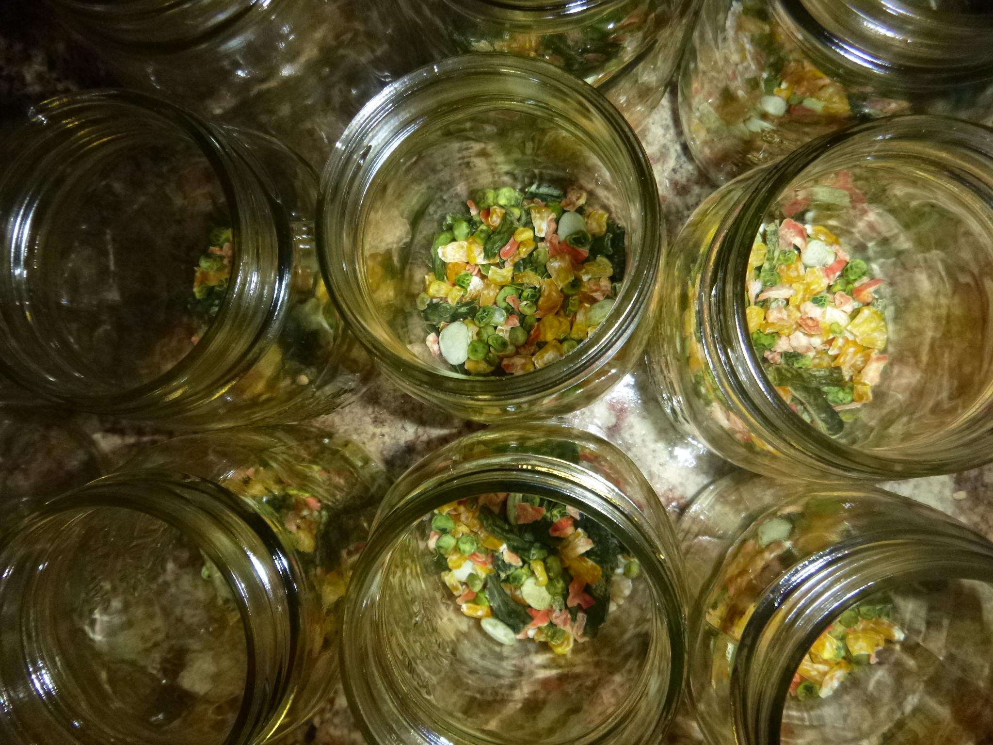 Each pint got 1 heaping tbsp. of pot barley and 2 tsp of mixed dried veggies, I had dried 2kg of mixed veggies for a presentation done on preservation and needed to use them up.