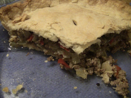 I made my regular pie crust but with a touch more salt then normal in it to go with the meat.. I cooked up half a pd of pork/half a pd of lamb, one big onion (grated), 1/4th a med size head of cabbage, one cup of mixed peppers red and green, spices where a mixed bag but for ease, I would say just use montreal steak spice, with a touch more garlic, along with a half tsp of cinnamon and 1/4th teaspoon of fresh grated nutmeg..